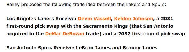 那么,马刺应该如何得到詹姆斯呢?此前,Bleacher Report名记Bailey曾给出这样一套4换2的方案——